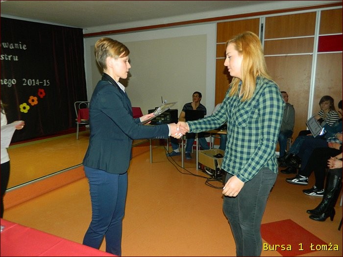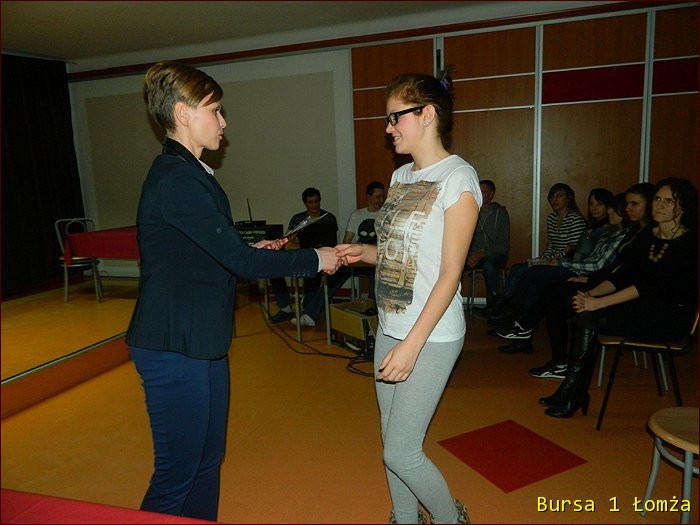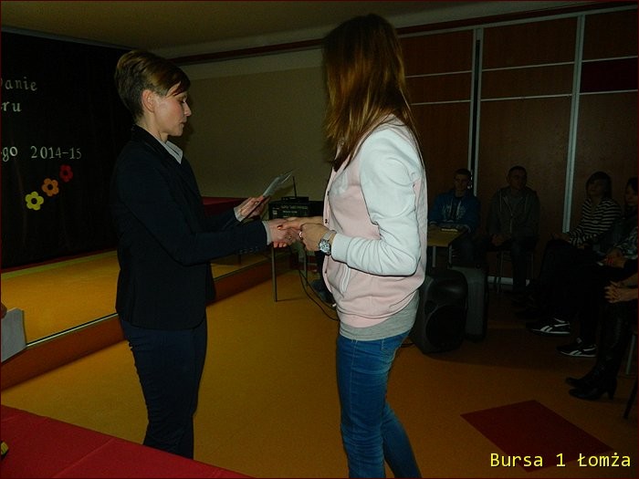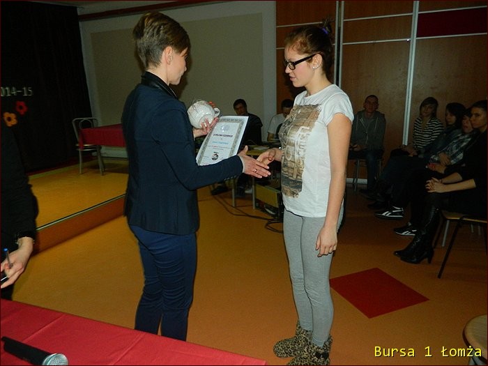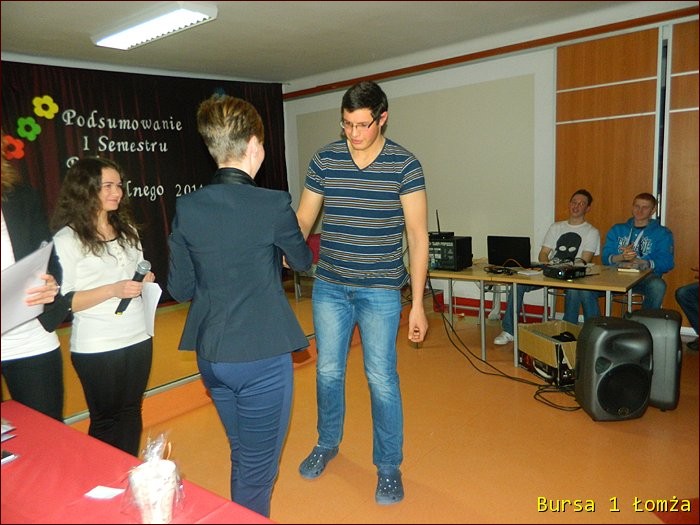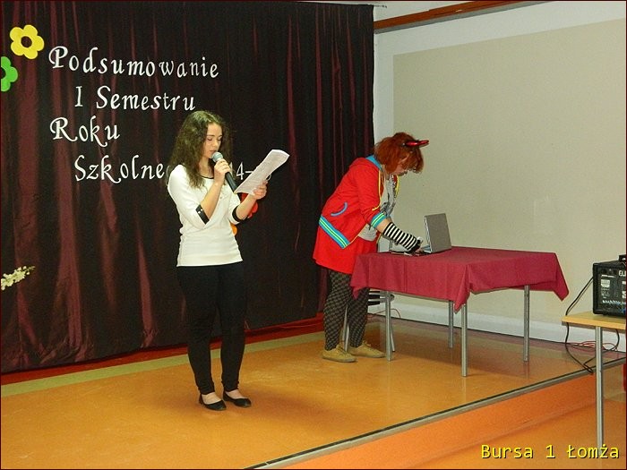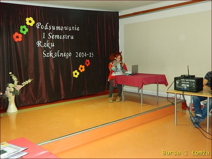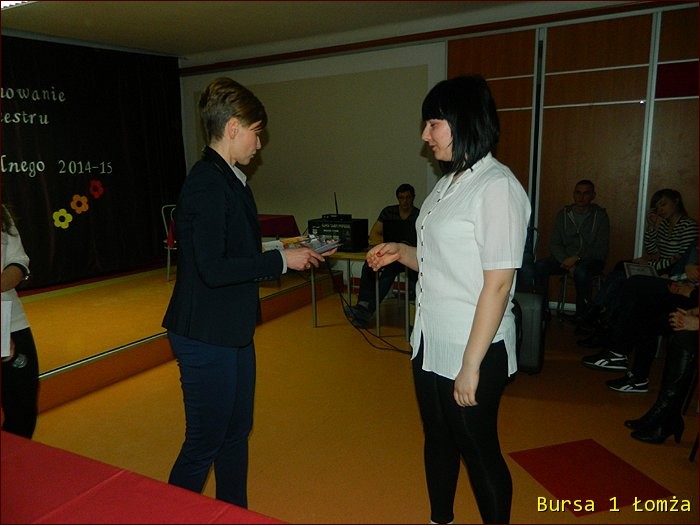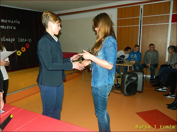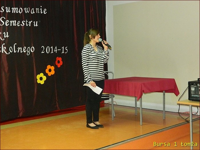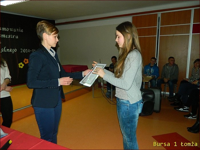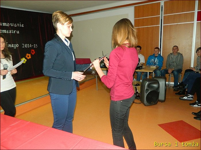 12 lutego 2015 roku w Bursie Szkolnej Nr 1 w Łomży odbyło się uroczyste podsumowanie I półrocza roku szkolnego 2014/2015. Spotkanie całej społeczności było okazją do nagrodzenia młodzieży, za udział oraz zaangażowanie w wiele wydarzeń mających miejsce w bursie oraz poza bursą. Prowadzącą uroczystość była wychowanka Martyna. Podopieczny Grzesiek przygotował prezentację multimedialną obrazującą całość naszych wydarzeń z kalendarza uroczystości i nie tylko. Ada w odpowiedniej scenerii przygotowała „List do mamy” odzwierciedlający życie w bursie w krzywym zwierciadle. Ewa natomiast zaśpiewała piosenki pt: „Miasto”, „Granda”, „Nie ufaj mi”. Nad całością organizacji uroczystości czuwały p. M. Dudzińska oraz p. L. Stpiczyńska.