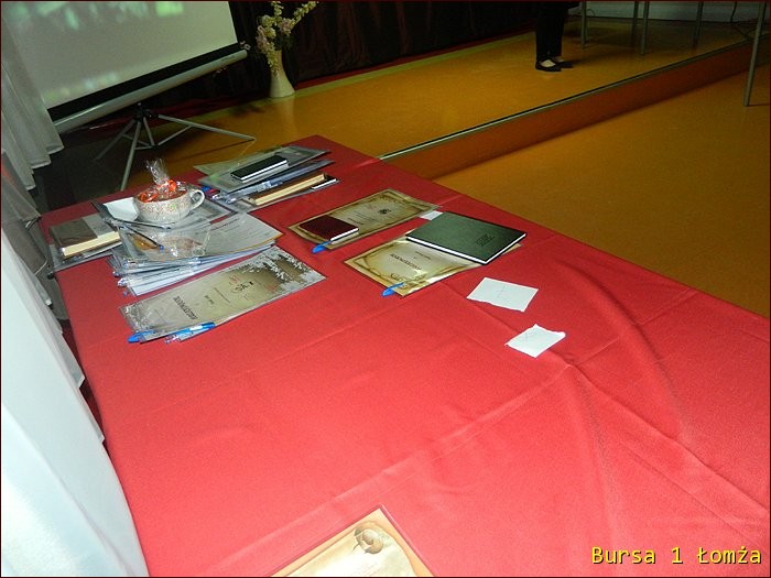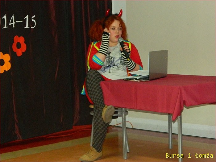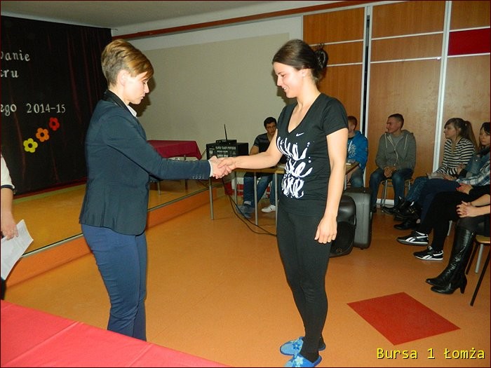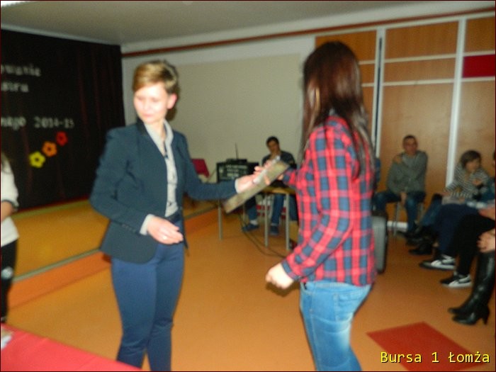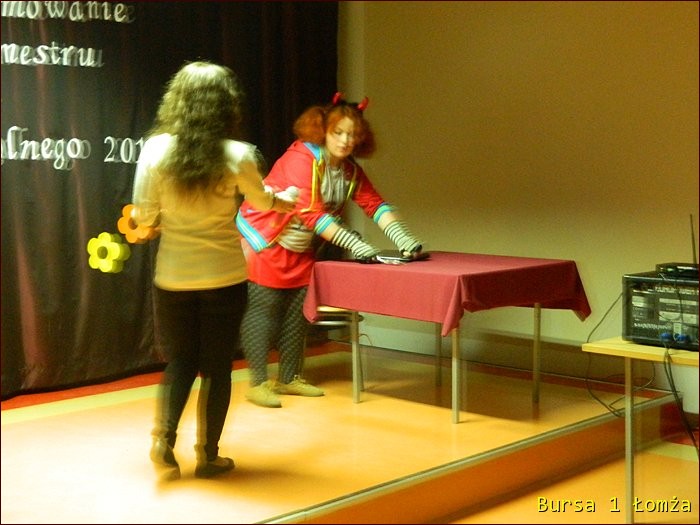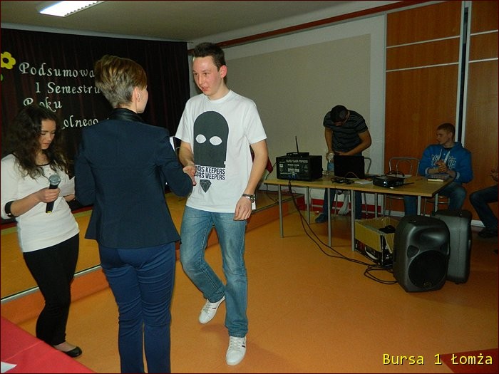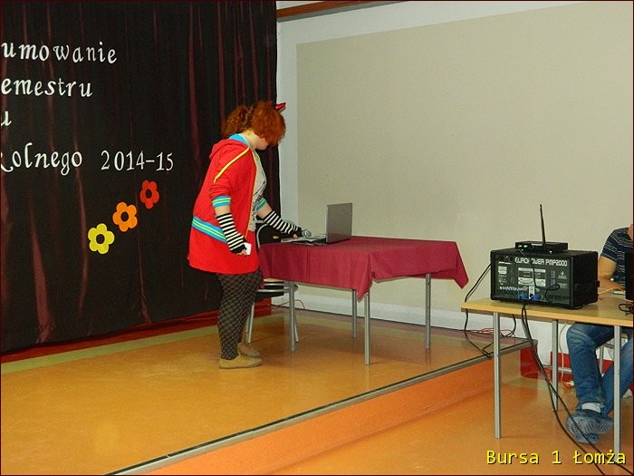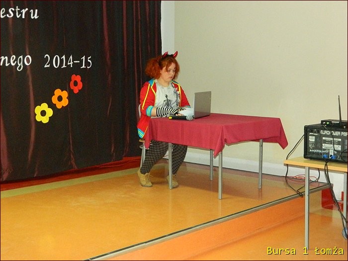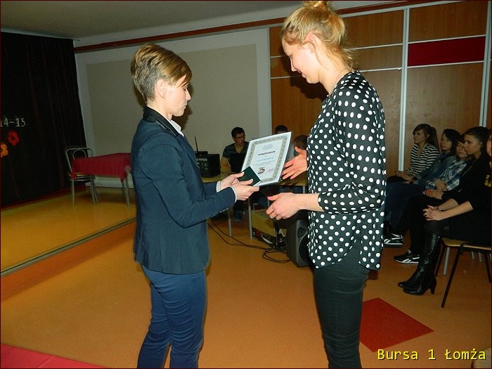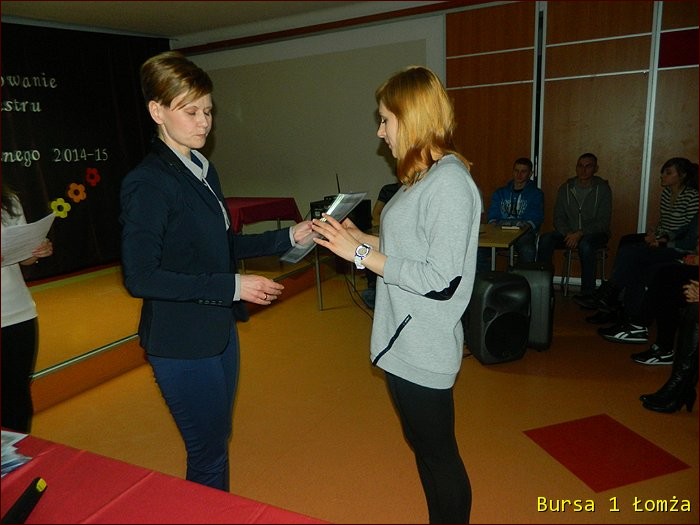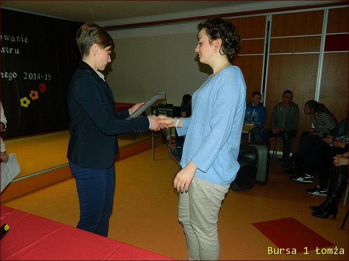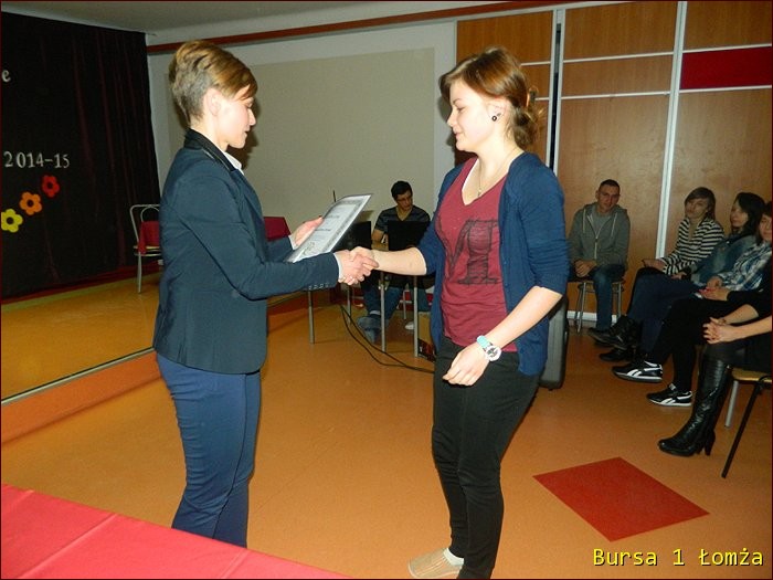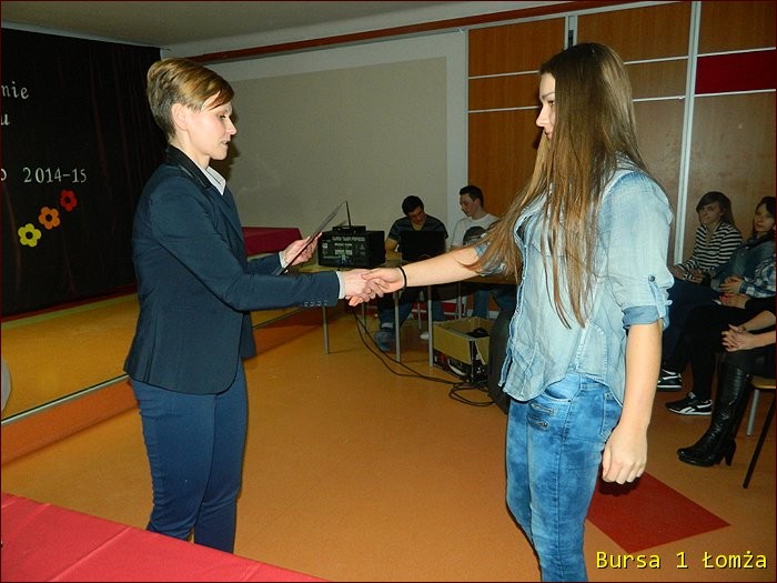 12 lutego 2015 roku w Bursie Szkolnej Nr 1 w Łomży odbyło się uroczyste podsumowanie I półrocza roku szkolnego 2014/2015. Spotkanie całej społeczności było okazją do nagrodzenia młodzieży, za udział oraz zaangażowanie w wiele wydarzeń mających miejsce w bursie oraz poza bursą. Prowadzącą uroczystość była wychowanka Martyna. Podopieczny Grzesiek przygotował prezentację multimedialną obrazującą całość naszych wydarzeń z kalendarza uroczystości i nie tylko. Ada w odpowiedniej scenerii przygotowała „List do mamy” odzwierciedlający życie w bursie w krzywym zwierciadle. Ewa natomiast zaśpiewała piosenki pt: „Miasto”, „Granda”, „Nie ufaj mi”. Nad całością organizacji uroczystości czuwały p. M. Dudzińska oraz p. L. Stpiczyńska.