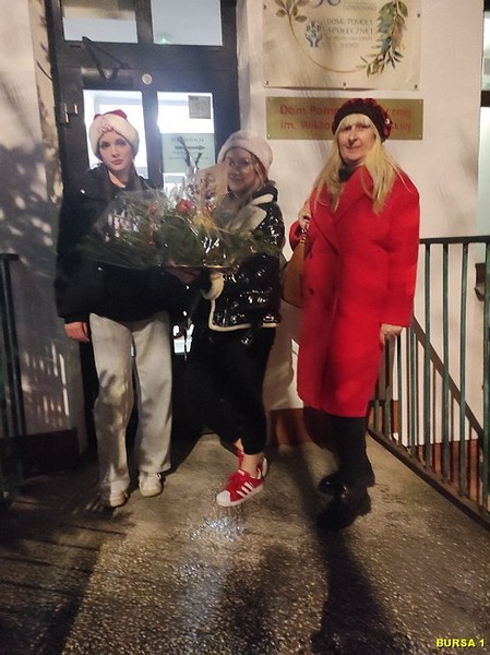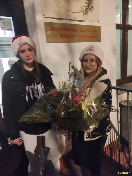 Dnia 20 grudnia 2023r. młodzież z bursy wraz z wychowawcami P. Beatą Kalinowską i P. Jolantą Lubak odwiedziły mieszkańców Domu Pomocy Społecznej im. Wiktorii Kowalewskiej. Wręczyły własnoręcznie wykonany stroik oraz złożyły życzenia radosnych Świąt Bożego Narodzenia oraz Szczęśliwego Nowego Roku.