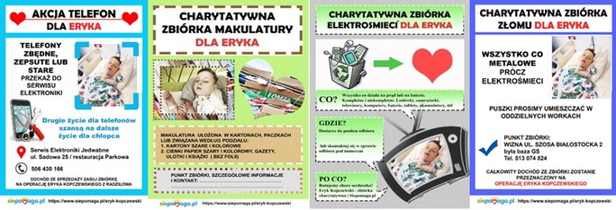 Rozpoczynamy też zbiórkę makulatury oraz zużytych telefonów komórkowych. Środki finansowe uzyskane ze zbiórki wesprą konto chorego Eryka.