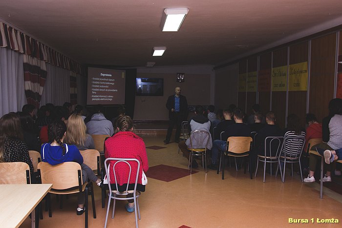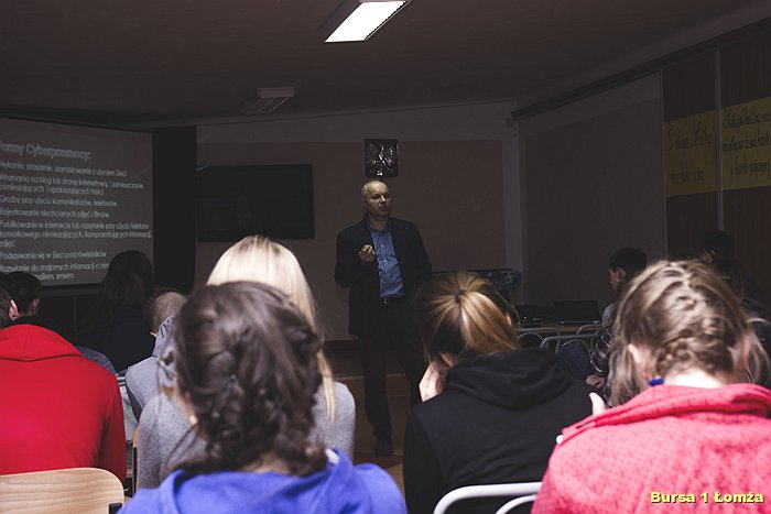 „Bezpieczeństwo w Internecie. Odpowiedzialne korzystanie z mediów społecznych” – to jeden z kierunków realizacji polityki oświatowej państwa na rok szkolny 2017/2018, ogłoszony przez Minister Edukacji Narodowej. W związku z tym dnia 20.02.2018r. w Bursie Szkolnej Nr 1 w Łomży odbyła się prelekcja, którą poprowadził p. K. Cwalina – wykładowca Wyższej Szkoły Agrobiznesu w Łomży.
