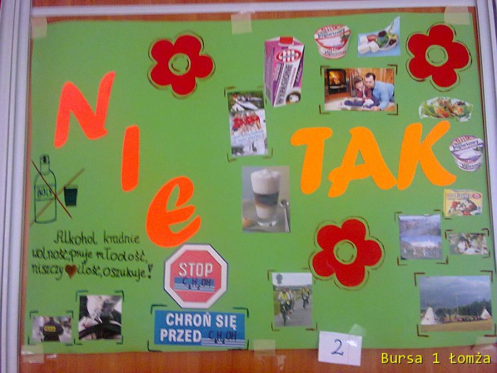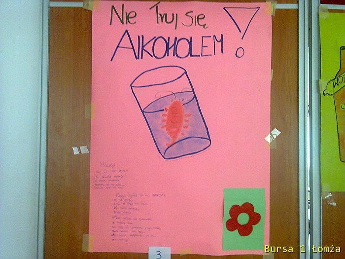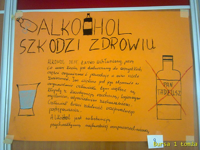 W Bursie Szkolnej Nr 1 w Łomży w kwietniu 2014 roku odbył się międzygrupowy konkurs plastyczny pt: „Alkohol szkodzi”. Organizatorkami były p. J. Świderska i p. U. Przesław. Wychowankowie wykonywali różnorodną techniką plakaty związane z powyższą tematyką. Wystawa wszystkich prac plastycznych została zorganizowana w świetlicy bursy, tak aby wszyscy wychowankowie mogli się z nią zapoznać. Nagrodzone prace zostały oprawione w antyramy i wyeksponowane na korytarzach placówki.