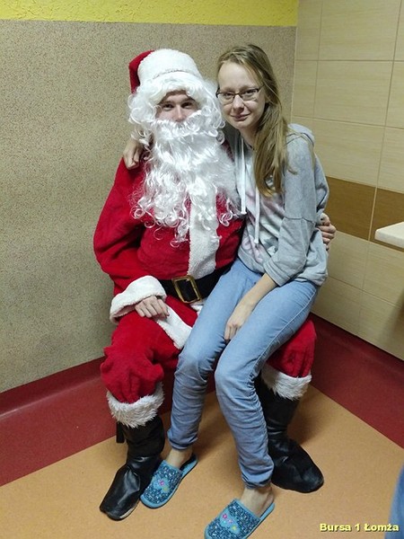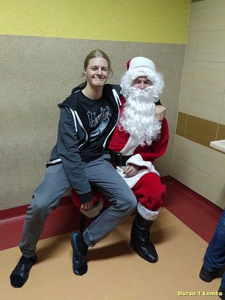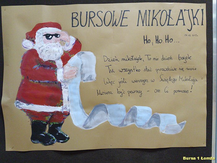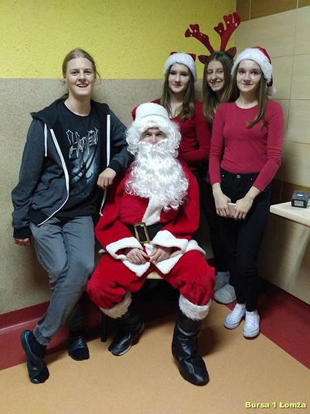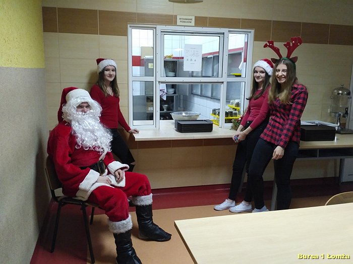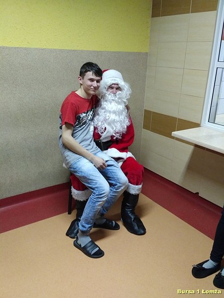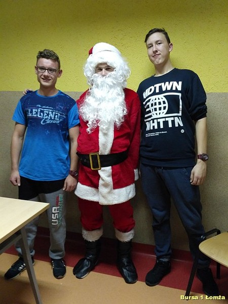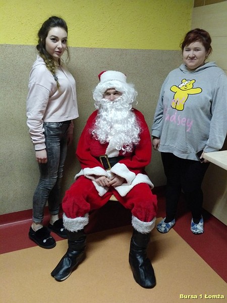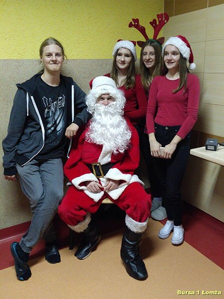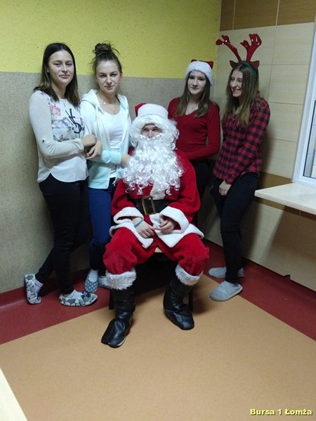Tuż przed kolacją Bursę Szkolną Nr 1 w Łomży odwiedził Święty Mikołaj i jego asystentki - Śnieżynki. Wszyscy mieszkańcy bursy byli bardzo grzeczni, obyło się bez rózgi. Były słodkie upominki, zdjęcia z mikołajem oraz dużo śmiechu. Zapraszamy do obejrzenia zdjęć: