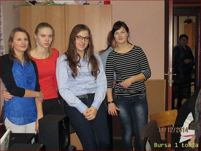 Koło Wolontariatu w Bursie Szkolnej Nr 1 w Łomży zorganizowało Mikołajki dla dzieci uchodźców z Czeczenii. Impreza odbyła się dnia 09.12.2014 roku w świetlicy Fundacji „Ocalenie”. Mali podopieczni świetlicy otrzymali paczki świąteczne, przygotowane przez wolontariuszki z Bursy. Były to słodycze pozyskane od przedsiębiorcy z naszego miasta oraz zabawki zebrane przez wolontariuszki. Radość dzieci nie miała końca, a paczki wręczył dzieciom „prawdziwy Mikołaj”. Nasze wolontariuszki po raz kolejny doświadczyły satysfakcji i wielu miłych chwil, gdyż mogą sprawić komuś radość.