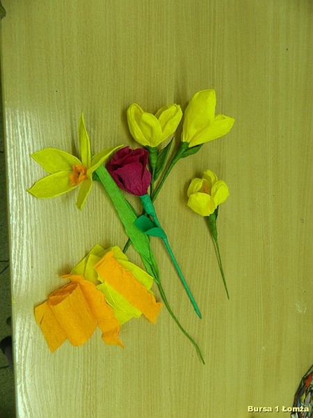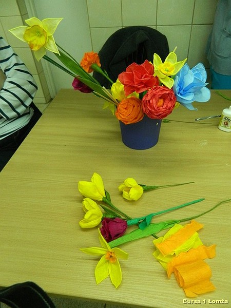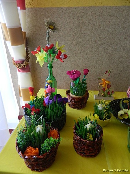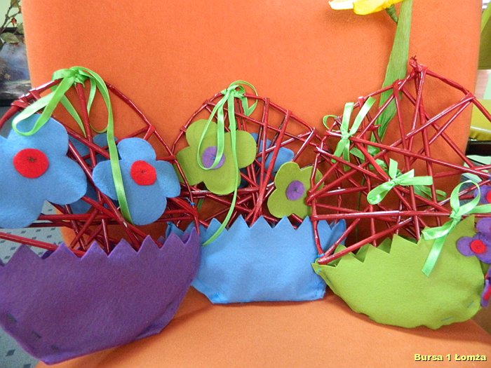 Wychowankowie mieli okazję nauczyć się wykonania palm wielkanocnych z tworzywa przyrodniczego, wiosennych kwiatów z krepiny oraz pisanek z wikliny papierowej, filcu i wełny.