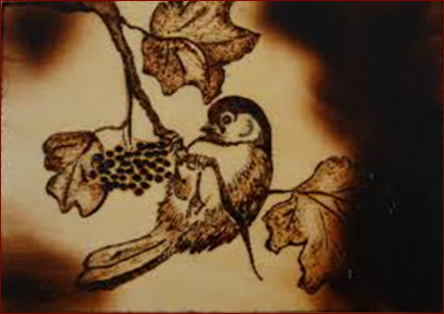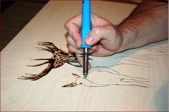 Kolejny etap to użycie pirografu. Obrazek wykonuje się poprzez staranne i dokładne wypalanie narysowanych linii oraz przestrzeni między nimi. Najlepsza jest wypalarka z regulacją mocy, dzięki której można manipulować głębią, otrzymując różne odcienie koloru. Wypalony napis lub rysunek należy wykończyć za pomocą lakieru lub oleju.