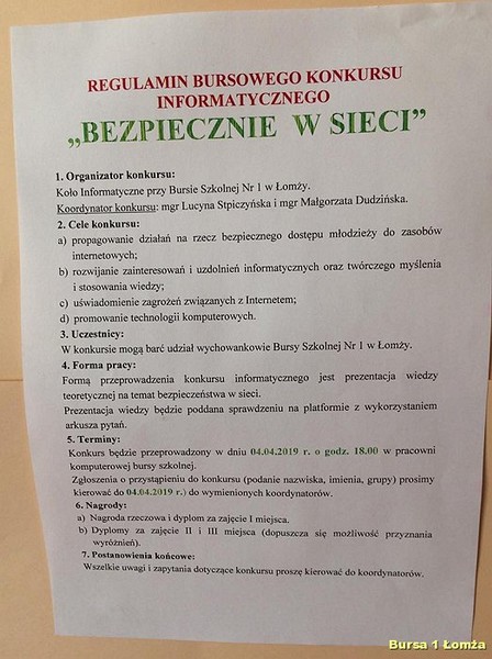 Dnia 04.04.2019 roku w Bursie Szkolnej Nr 1 w Łomży odbył się konkurs informatyczny wiedzy na temat "Bezpiecznie w Sieci". Ogółem w konkursie udział wzięło 23 wychowanków z różnych grup wychowawczych. Na specjalnie przygotowanej platformie młodzież odpowiedziała na 40 pytań, dotyczących niebezpieczeństw płynących z Sieci oraz wskazywała na sposoby radzenia sobie z nimi.