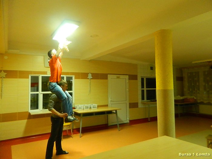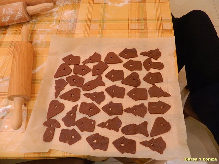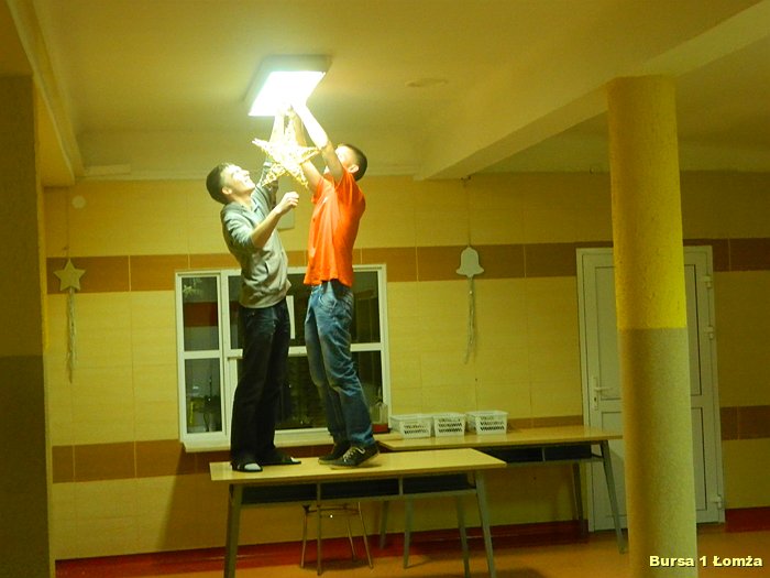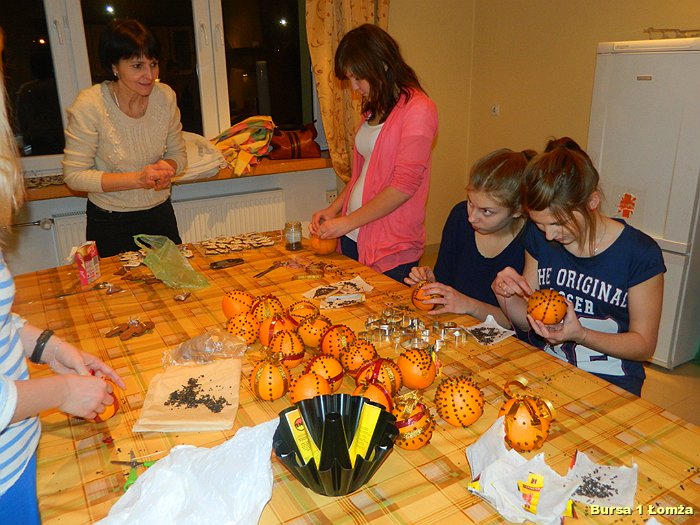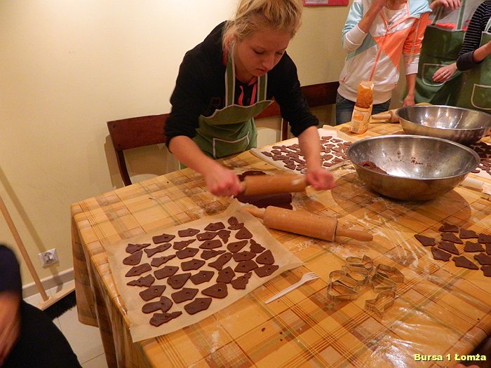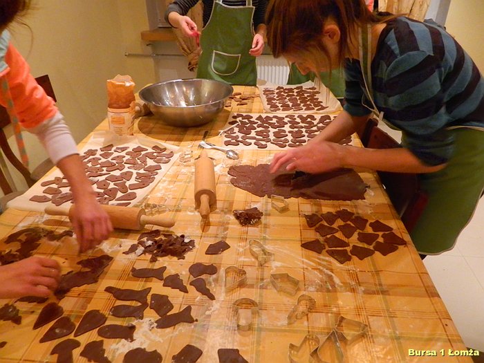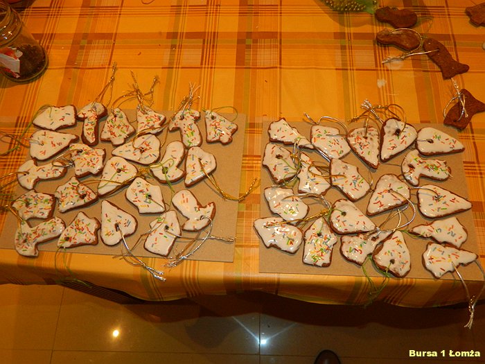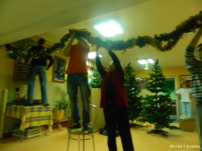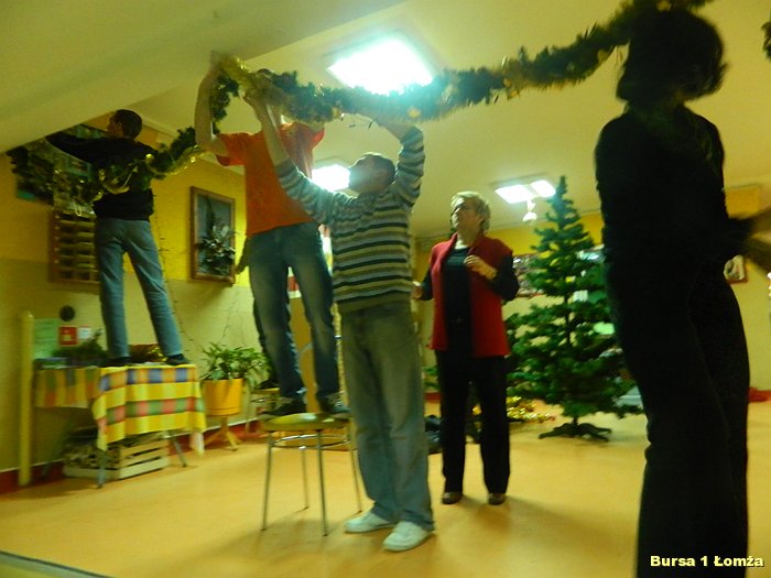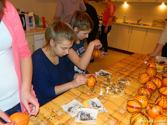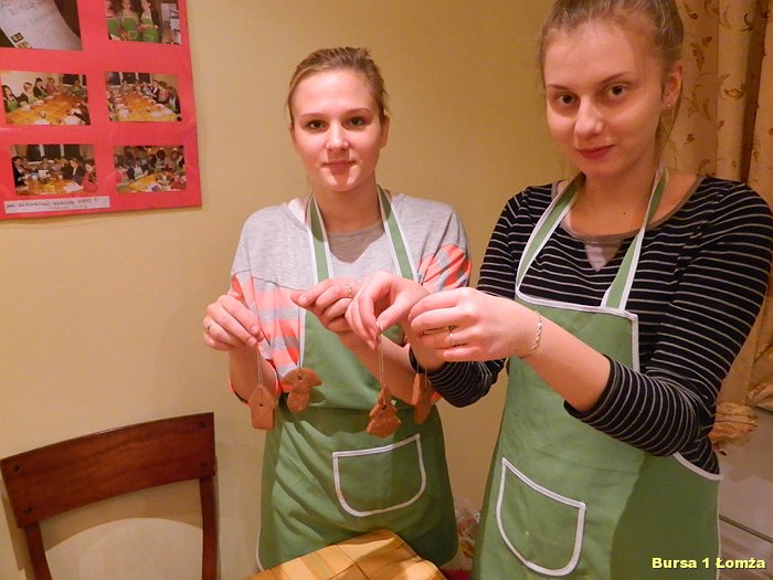 Przygotowania do Wigilii w Bursie Szkolnej Nr 1 w Łomży rozpoczęły się 5 grudnia 2013 roku. Wychowanki z koła kulinarnego piekły różnego rodzaju pierniki w kształcie grzybka, domku, zajączka, ryby oraz choinki. Jednym z najbardziej charakterystycznych, świątecznych symboli był ciepły, korzenny zapach piernika, który unosił się w całej bursie. Pięknie wypieczone pierniki udekorowane masą cukrową, kolorową posypką zostały powieszone na choince. Oprócz zapachu piernika równie intensywnie czuć było aromat pomarańczy, które były ozdabiane goździkami oraz pięknymi wstążkami. Pomarańcze były świetną dekoracją stołów wigilijnych. Poza kulinarną działalnością wychowanek również poszczególne grupy brały czynny udział w dekoracji holu, świetlicy oraz stołówki na wieczerzę wigilijną.