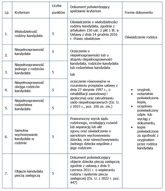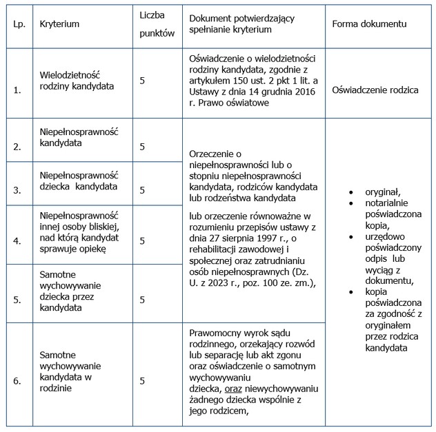 W przypadku kandydata niepełnoletniego są to kryteria wymienione w tabeli nr 1 i 3, a w przypadku kandydata pełnoletniego kryteria wymienione w tabeli 2 i 3.