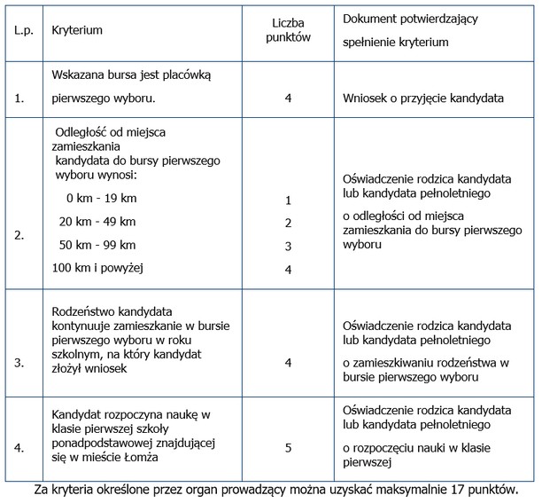 Określa je Uchwała Nr 261/XXIV/2020 Rady Miasta Łomża z dnia 29 kwietnia 2020 r. w sprawie określenia kryteriów i punktów postępowania rekrutacyjnego do publicznych placówek zapewniających opiekę i wychowanie uczniom w okresie pobierania nauki poza miejscem stałego zamieszkania prowadzonych przez Miasto Łomża.