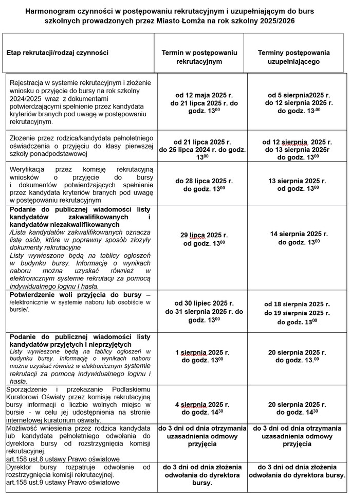 Rekrutacja młodzieży do publicznych placówek, zapewniających opiekę i wychowanie uczniom w okresie pobierania nauki poza miejscem stałego zamieszkania, na rok szkolny 2025/2026 jest prowadzona na podstawie odpowiednich przepisów Rozdziału 6 „Przyjmowanie do publicznych przedszkoli, publicznych form wychowania przedszkolnego, publicznych szkół i publicznych placówek” - ustawy Prawo oświatowe (Dz.U. z 202 r. poz. 737 z późn. zm.), a w szczególności na podstawie art. 145 tej ustawy oraz zasad uzgodnionych z dyrektorami burs.