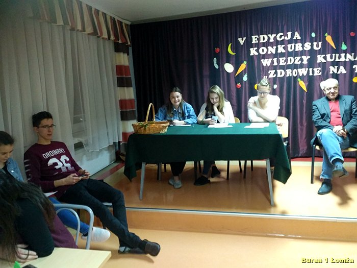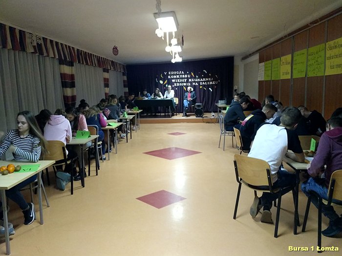 Dnia 10.01.2019 r. w Bursie Szkolnej Nr w Łomży odbył się konkurs wiedzy kulinarnej pt „Zdrowie na talerzu”. W konkursie w zespołach trzyosobowych rywalizowała młodzież z dziesięciu grup wychowawczych. Organizatorami konkursu byli opiekunowie koła kulinarnego. Emocji podczas konkursu nie brakowało. Zawodnicy w pierwszej części konkursu mieli za zadanie rozwiązać krzyżówkę, natomiast w drugiej części testu wybrać jedną prawidłową odpowiedź. Za całość można było zdobyć 30 punktów. Nad prawidłowym przebiegiem rozgrywki czuwało czteroosobowe jury. Zwycięzcami konkursu dotyczącego zdrowego żywienia zostali: