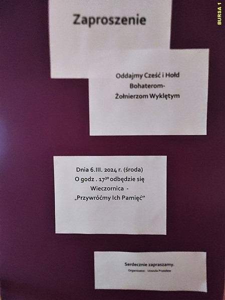 Z tej też okazji w środę 06 marca 2024 roku odbyła się Wieczornica pt.: „Przywróćmy Ich Pamięć”. W uroczystości udział wzięli: zaproszeni Goście: Pan Kazimierz Polkowski -Członek Zarządu Związku Żołnierzy Narodowych Sił Zbrojnych Okręgu Łomża, Pan Jacek Zalewski i Pan Piotr Zalewski - członkowie Grupy Edukacji Historycznej Reduta Kurpiowska, jak również Wychowawcy i Wychowankowie.