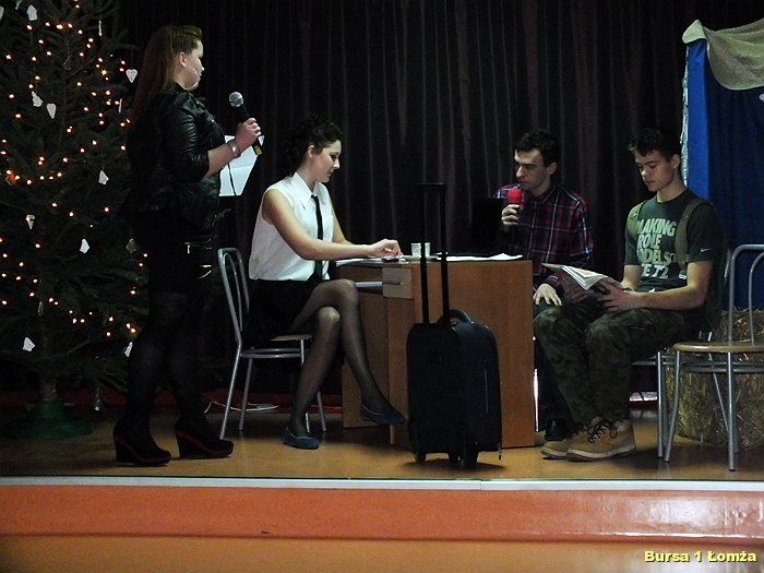 Zanim wspólnie zasiedliśmy do wieczerzy wigilijnej obejrzeliśmy przedstawienie pod tytułem: „Brak wolnych pokoi”. Występ artystyczny przygotowali wychowankowie pod opieką P. Marty Jankowskiej i P. Beaty Pezowicz. Przedstawienie było bardzo współczesne, ale przesłanie takie, jak ponad dwa tysiące lat temu, kiedy Jezus Chrystus przyszedł na świat i nie było dla niego miejsca.