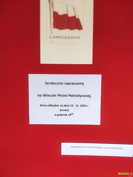 Dnia 15.11.2023 r. w bursie odbył się „Wieczór Pieśni Patriotycznej”. Na uroczystości w świetlicy licznie zgromadziła się młodzież wraz z wychowawcami. Uroczystość rozpoczęto wspólnym odśpiewaniem „Mazurka Dąbrowskiego”.