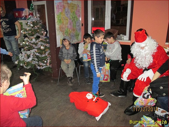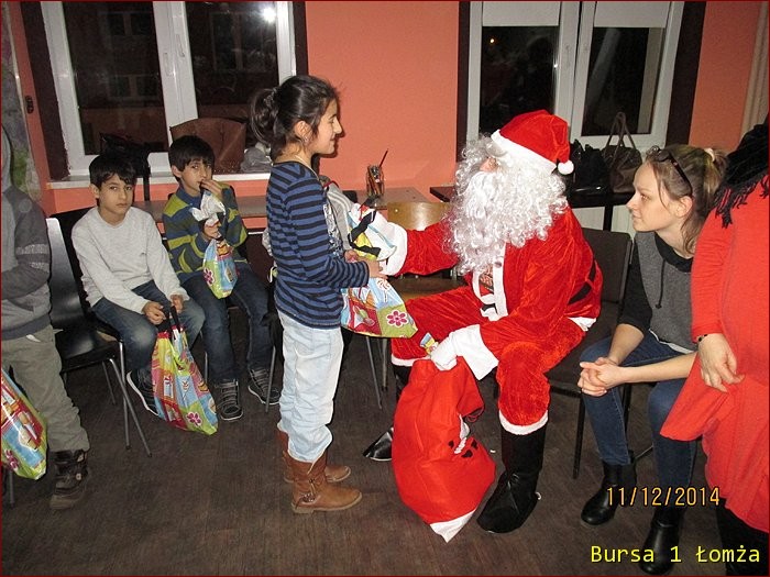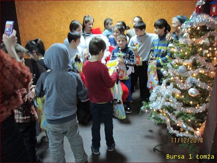 Koło Wolontariatu w Bursie Szkolnej Nr 1 w Łomży zorganizowało Mikołajki dla dzieci uchodźców z Czeczenii. Impreza odbyła się dnia 09.12.2014 roku w świetlicy Fundacji „Ocalenie”. Mali podopieczni świetlicy otrzymali paczki świąteczne, przygotowane przez wolontariuszki z Bursy. Były to słodycze pozyskane od przedsiębiorcy z naszego miasta oraz zabawki zebrane przez wolontariuszki. Radość dzieci nie miała końca, a paczki wręczył dzieciom „prawdziwy Mikołaj”. Nasze wolontariuszki po raz kolejny doświadczyły satysfakcji i wielu miłych chwil, gdyż mogą sprawić komuś radość.