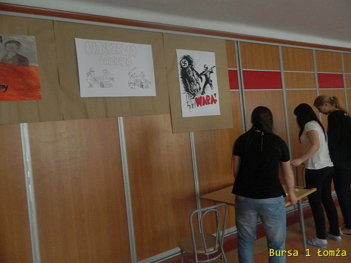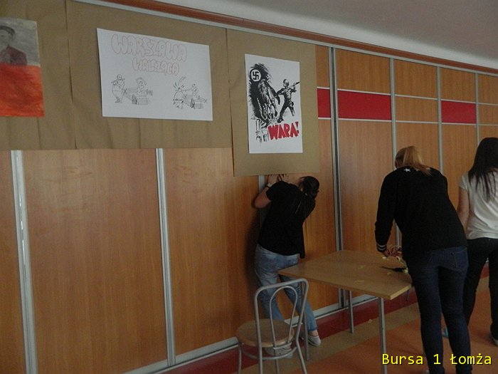 Dnia 16 marca 2015 roku przystąpiliśmy do realizacji projektu pt. „Szlakiem Powstania Warszawskiego”. Głównym założeniem projektu było propagowanie wartości patriotycznych i kształtowanie postaw patriotycznych wśród młodzieży. Pierwsze działanie polegało na wykonaniu przez młodzież uczestniczącą w projekcie plakatów o tematyce „Mały sabotaż” konspiracyjnej organizacji „Wawer” w okupowanej Warszawie. W świetlicy Bursy została przygotowana wystawa prac plastycznych, którą mogli podziwiać wszyscy mieszkańcy i pracownicy Bursy. Wystawa stanowiła też niewątpliwie doskonałą scenografię wieczornic i spotkań tematycznych ujętych w harmonogramie projektu.