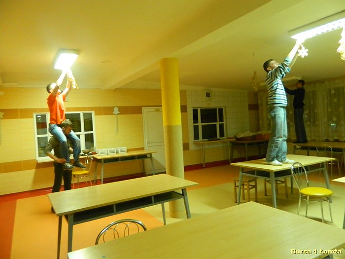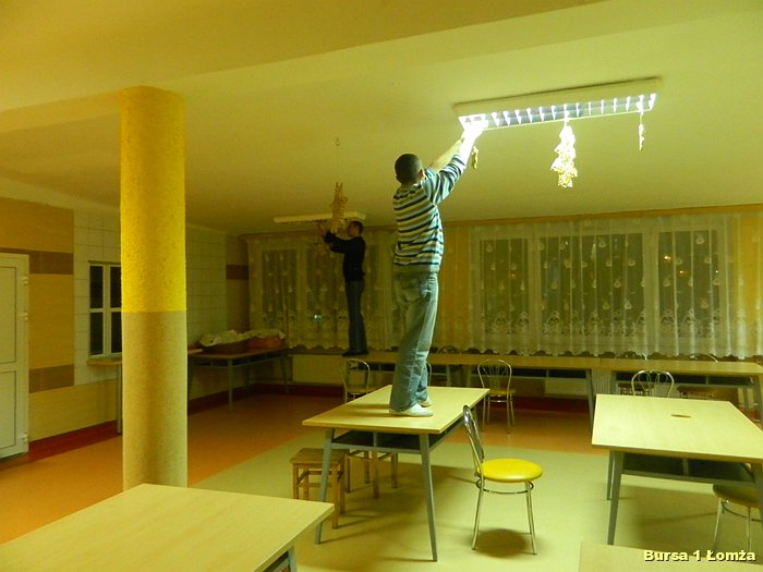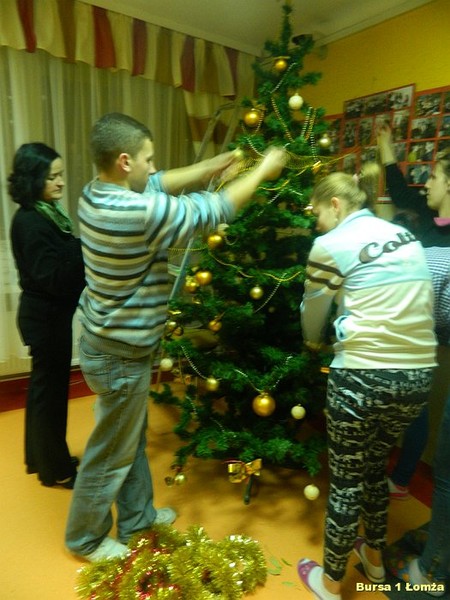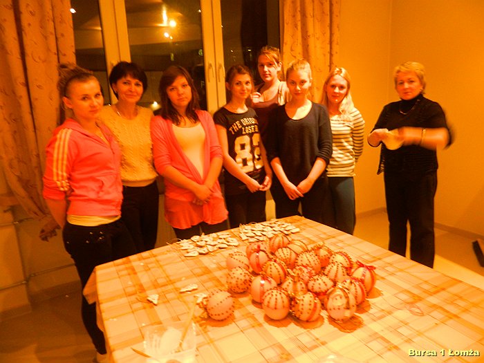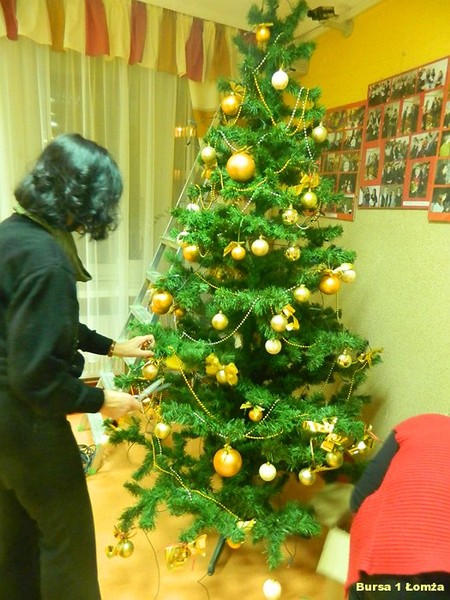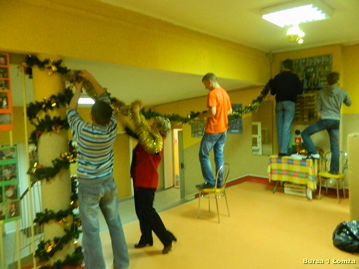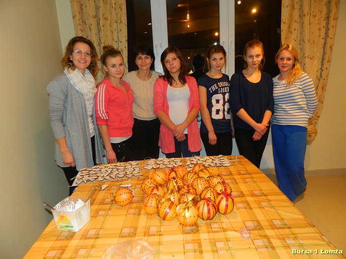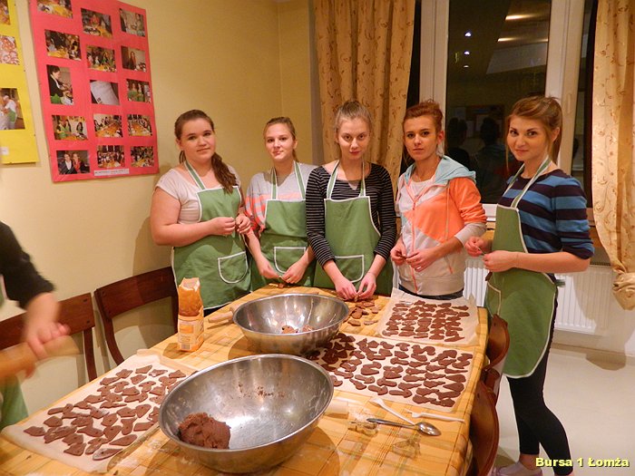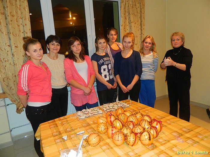 Przygotowania do Wigilii w Bursie Szkolnej Nr 1 w Łomży rozpoczęły się 5 grudnia 2013 roku. Wychowanki z koła kulinarnego piekły różnego rodzaju pierniki w kształcie grzybka, domku, zajączka, ryby oraz choinki. Jednym z najbardziej charakterystycznych, świątecznych symboli był ciepły, korzenny zapach piernika, który unosił się w całej bursie. Pięknie wypieczone pierniki udekorowane masą cukrową, kolorową posypką zostały powieszone na choince. Oprócz zapachu piernika równie intensywnie czuć było aromat pomarańczy, które były ozdabiane goździkami oraz pięknymi wstążkami. Pomarańcze były świetną dekoracją stołów wigilijnych. Poza kulinarną działalnością wychowanek również poszczególne grupy brały czynny udział w dekoracji holu, świetlicy oraz stołówki na wieczerzę wigilijną.