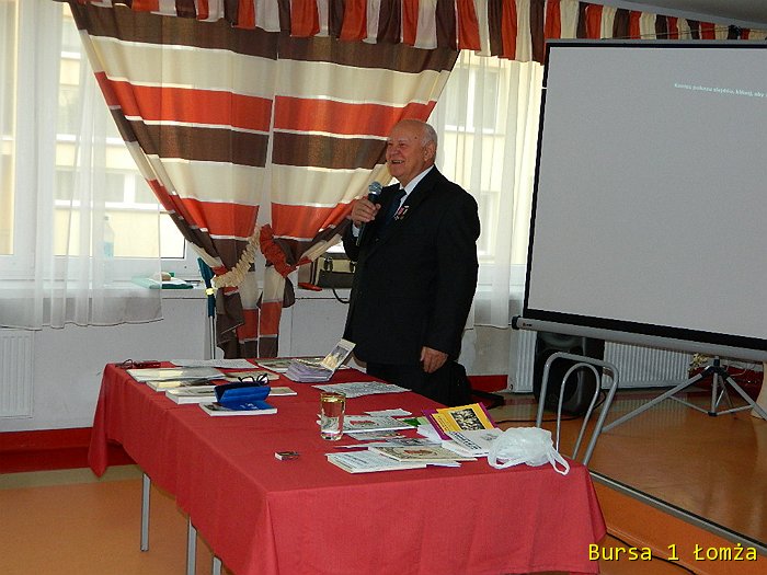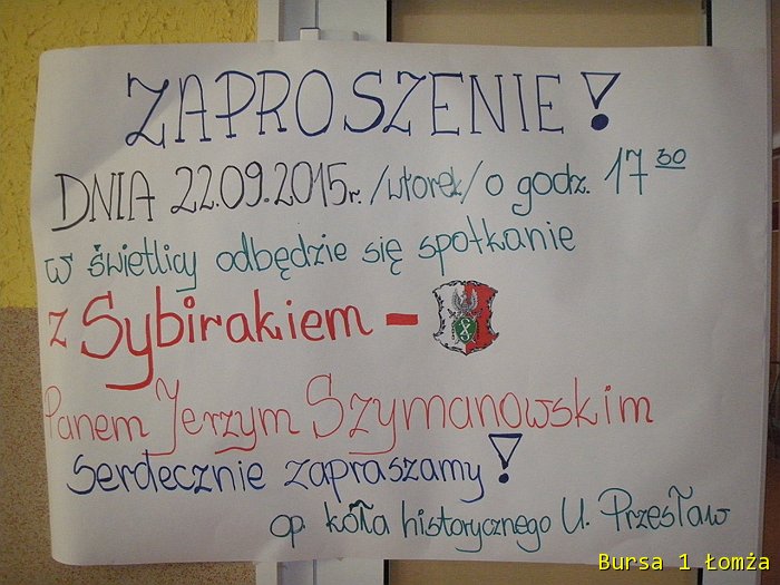 Dnia 22 września 2015 roku zrealizowaliśmy kolejne zadanie z Projektu „Wieczna Pamięć”. Licznie zgromadzona młodzież z Bursy Szkolnej Nr 1 w Łomży wraz z wychowawcami uczestniczyła w spotkaniu z Sybirakiem Panem Jerzym Szymanowskim.