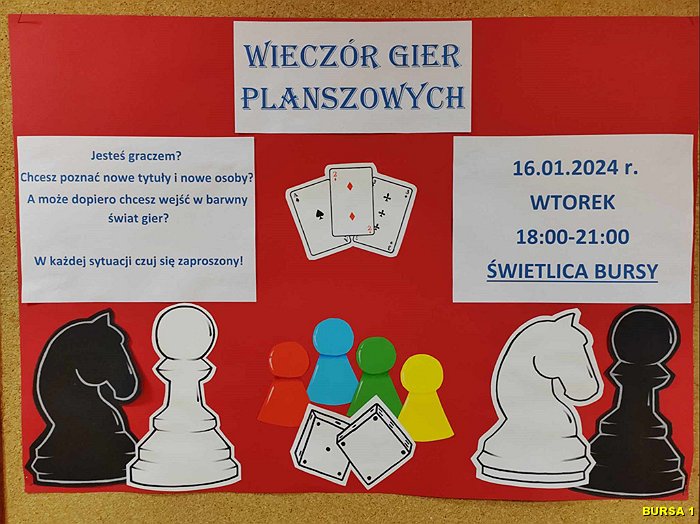 Dnia 16 stycznia 2024 r. w Bursie Szkolnej Nr 1 w Łomży odbył się Wieczór gier planszowych. Młodzież miała okazję zagrać w nowe gry, zakupione do biblioteki bursy. Powodzeniem cieszyły się Uno, Szachy, Warcaby, Monopoly, Dixit, Chińczyk.